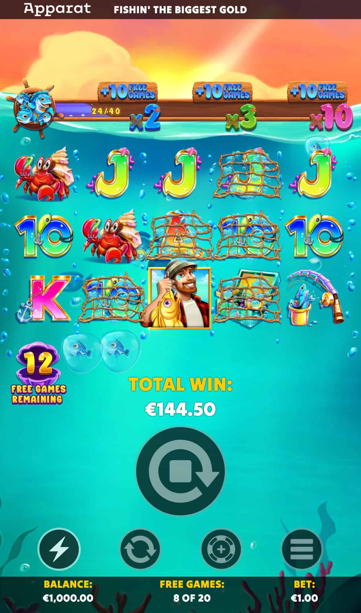 Once you’re in, every Fish you catch fills your Progress Bar — and every Fisherman hauls in the cash values from all Fish on the reels. Collect 40 Fish to advance to the next stage — reel your way to 50 Free Games & 10x wins!