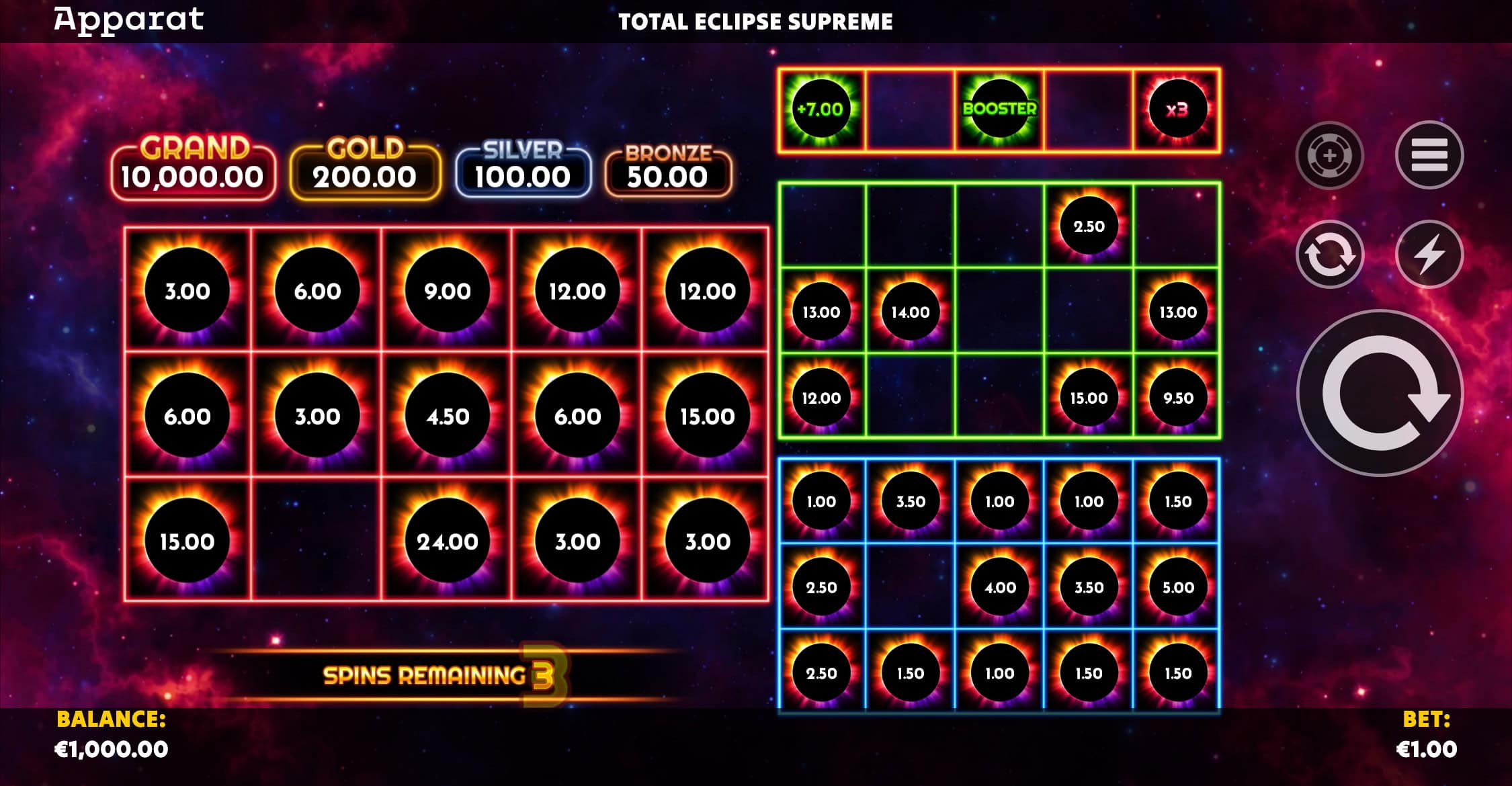 The final 5th grid is the command center, home to powerful Power-Up symbols. Unleash Boosters, Payers, Multipliers, and Collectors to dominate the reels and amass astronomical wins. Can you achieve the ultimate alignment by filling all 50 cells to claim the legendary GRAND prize of 10,000X?
