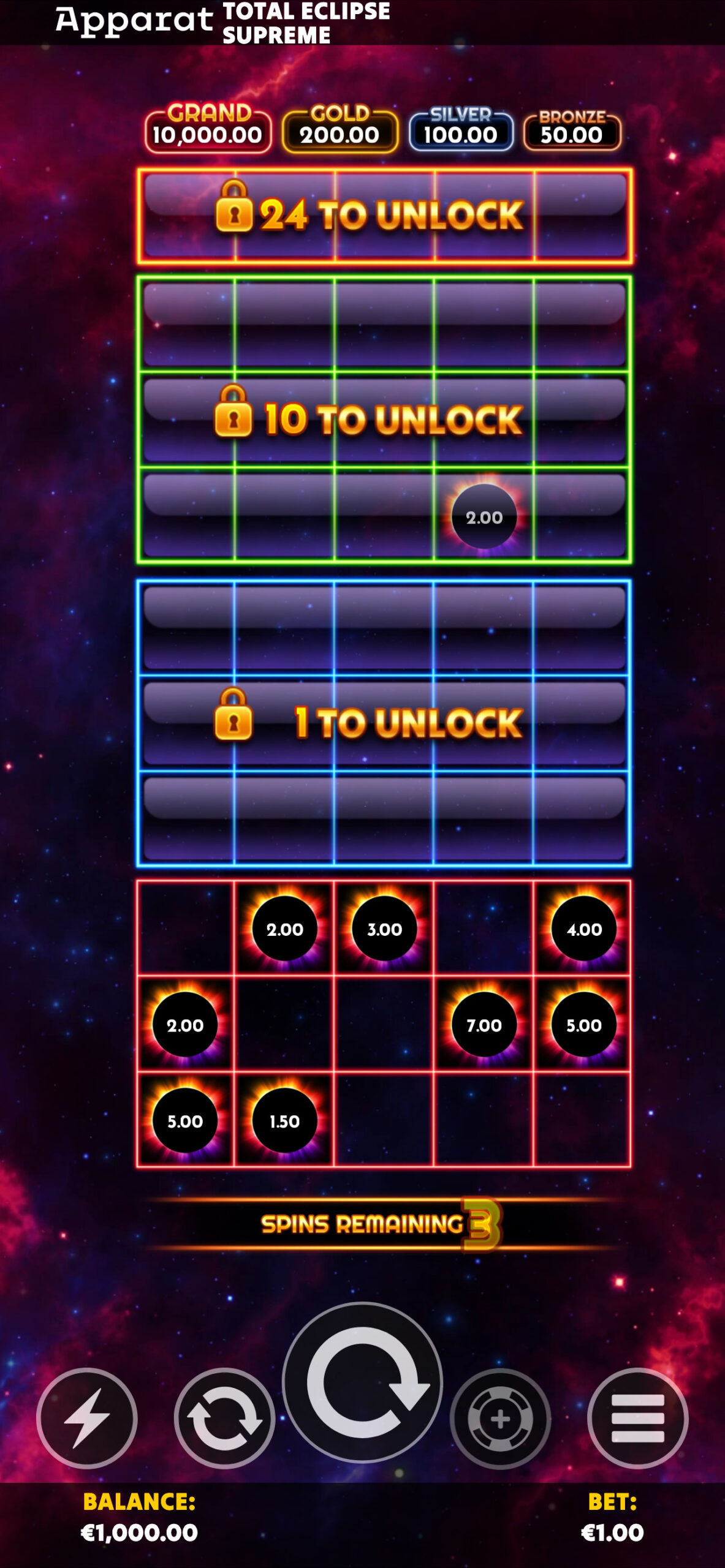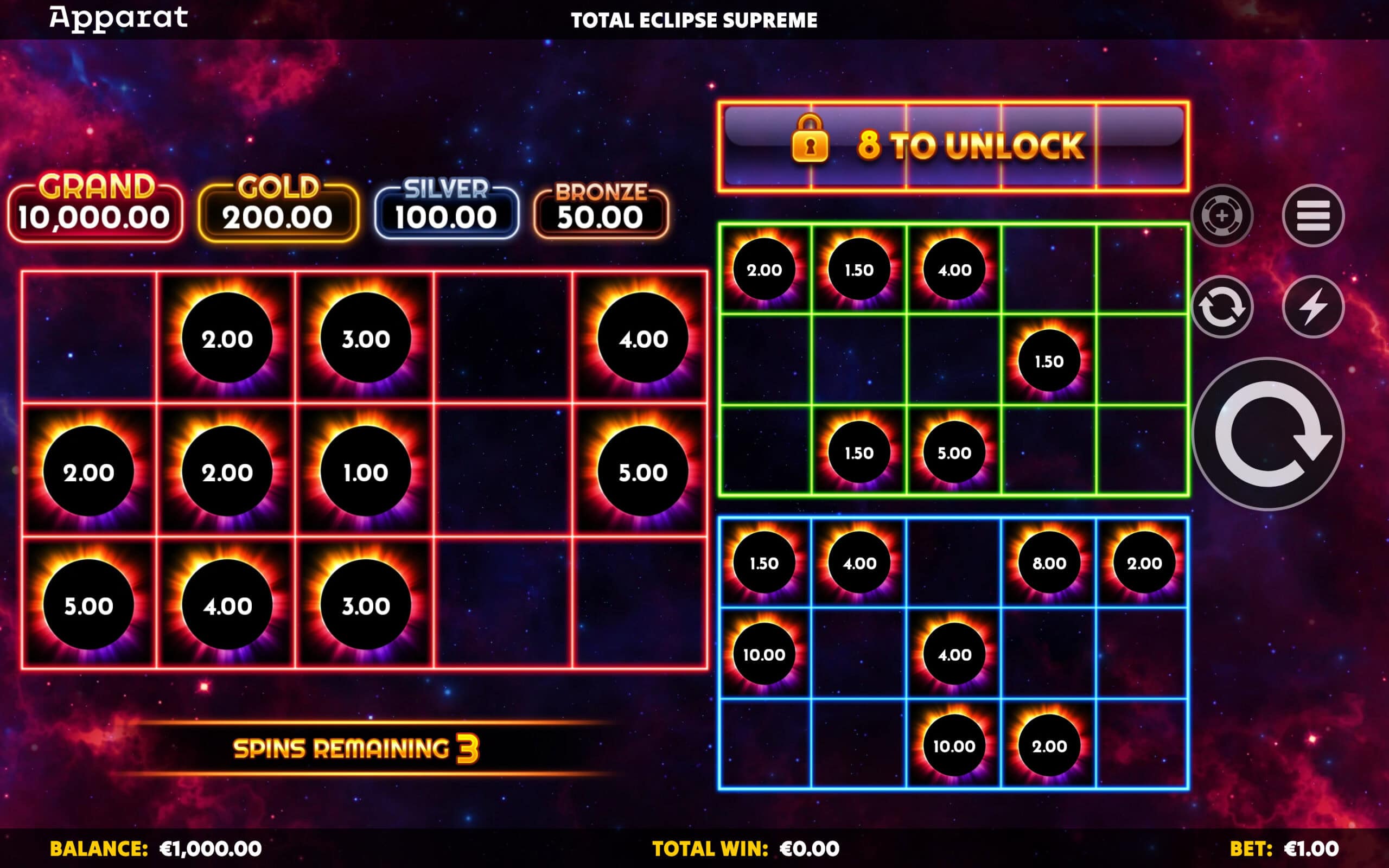 Dive into an atmospheric adventure where the total eclipse unlocks a universe of potential! Trigger the free games with 5 Eclipse symbols and witness the awakening of five mysterious reel grids. Start with one and expand your domain by collecting more Eclipse symbols to unlock additional reel areas, each brimming with cosmic energy!